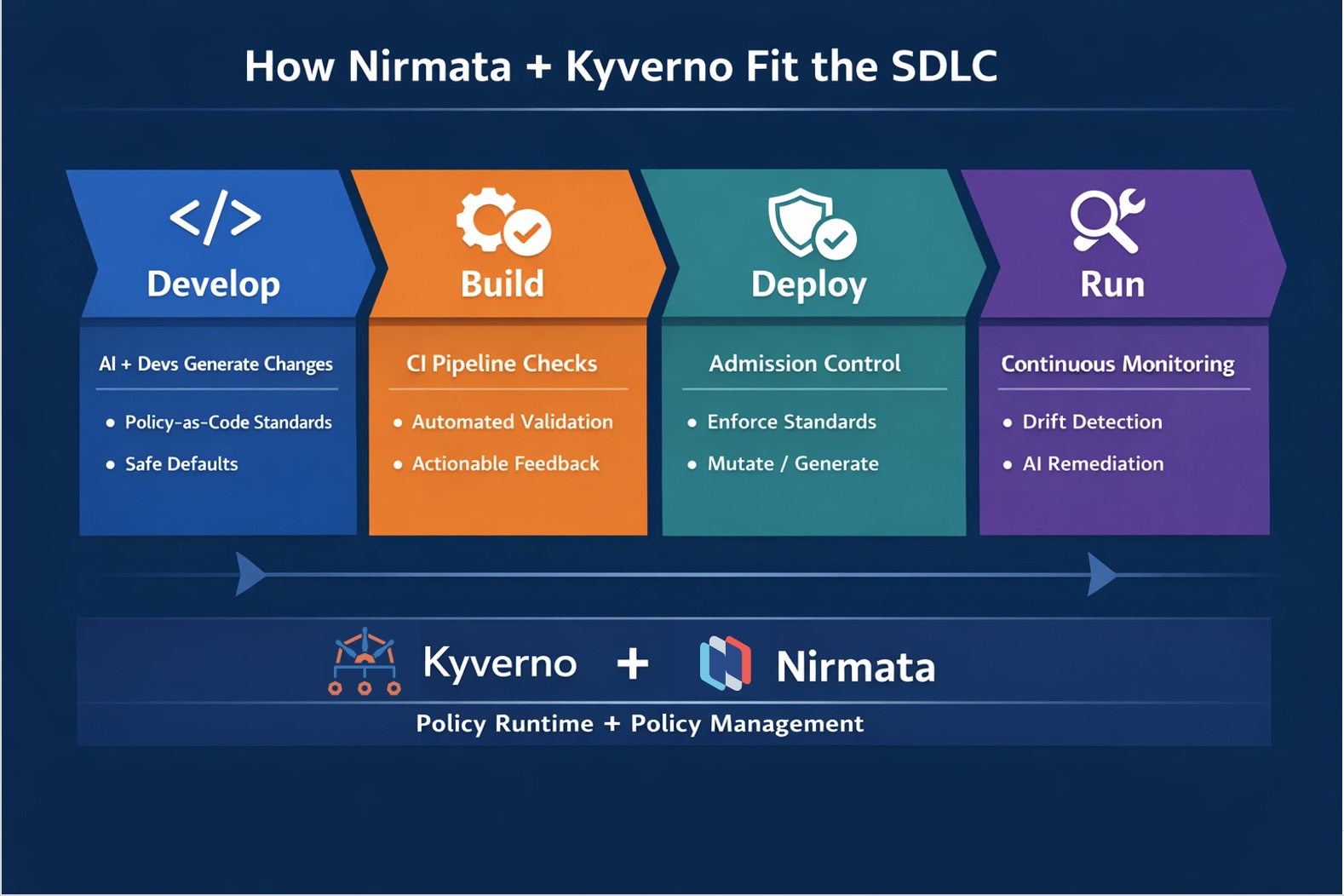 Kyverno + Nirmata provide the guardrail system to do this across the full software lifecycle: Develop → Build → Deploy → Run.