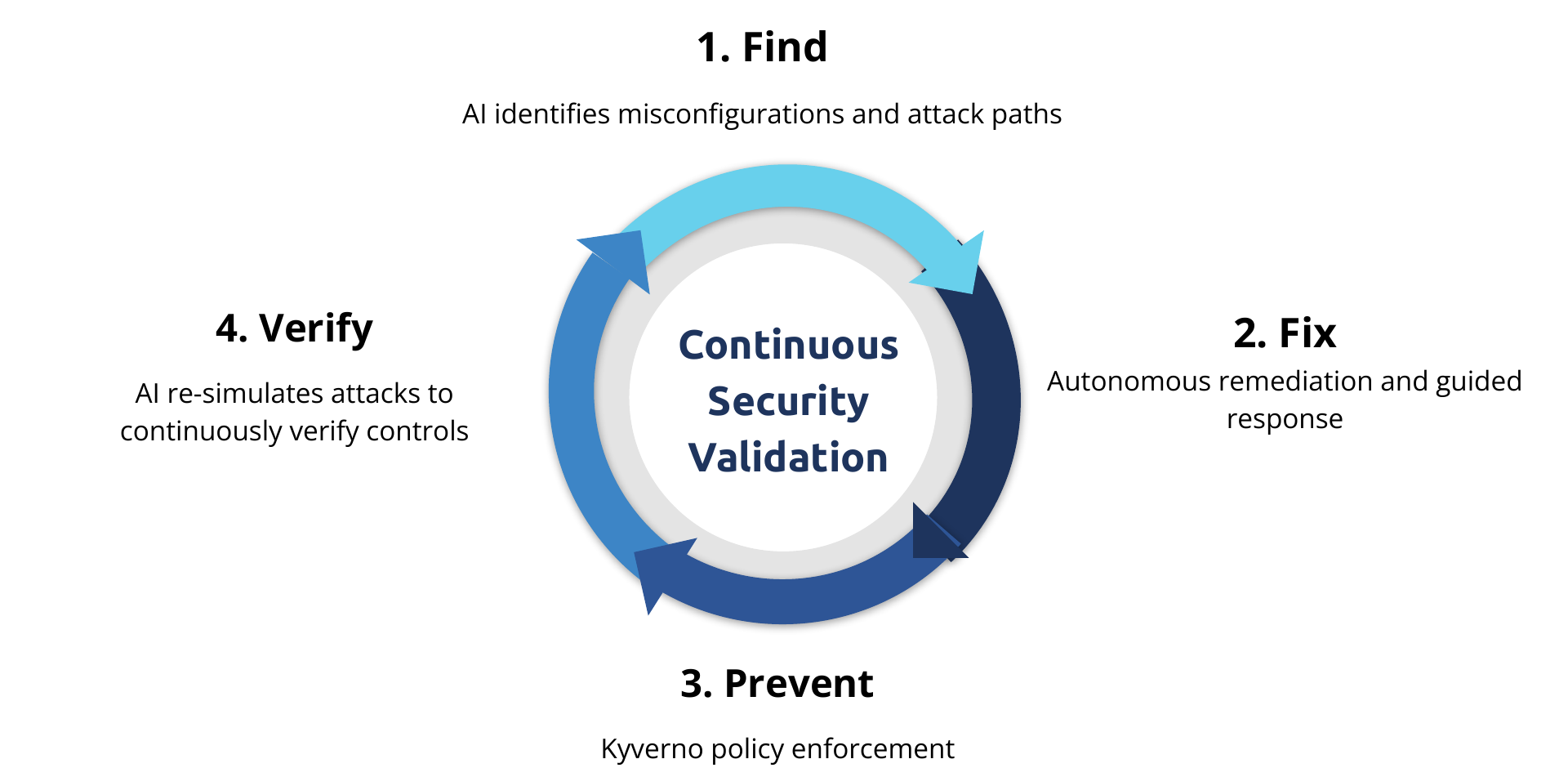 That closed loop is explicit: Find, Fix, Prevent, Verify, with Kyverno policy enforcement as the preventive layer and continuous security validation at the center.